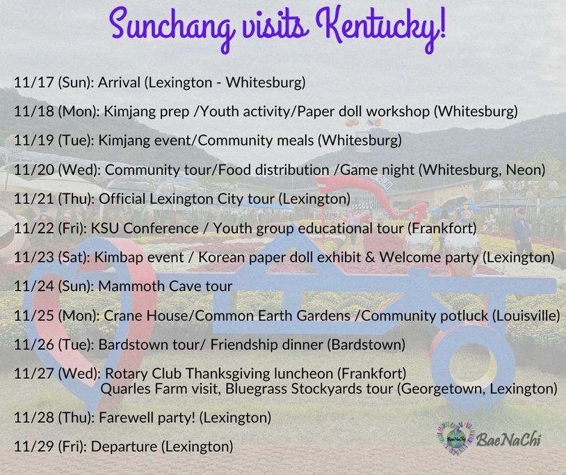 It takes a village to create a BaeNaChi travel program for our mission of learning, sharing, and healing. One of our Korea trip 2023 participants summed up his travel experience by saying “We were not tourists.” A long list of our Korean friends and partner groups pitched in to make this kind of special experience possible. BaeNaChi programs are about connecting and growing together as a global community through shared experiences in different cultures. Our Kentucky Trip 2024 program wasn't the exception. Both our Korean visitors and local partners did an excellent job working together and supporting one another to create the most unforgettable two weeks of awesome cultural exchange and spiritual growth and healing together.